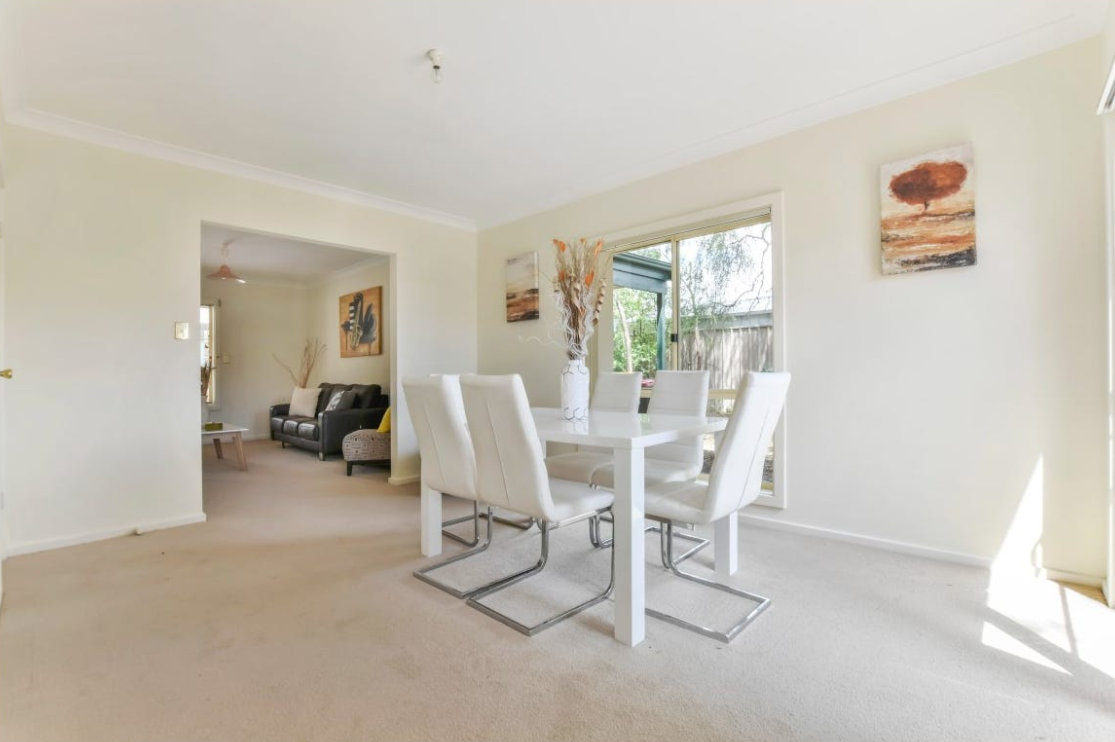 - Bright open-plan living and dining area with neutral tones and easy-care flooring