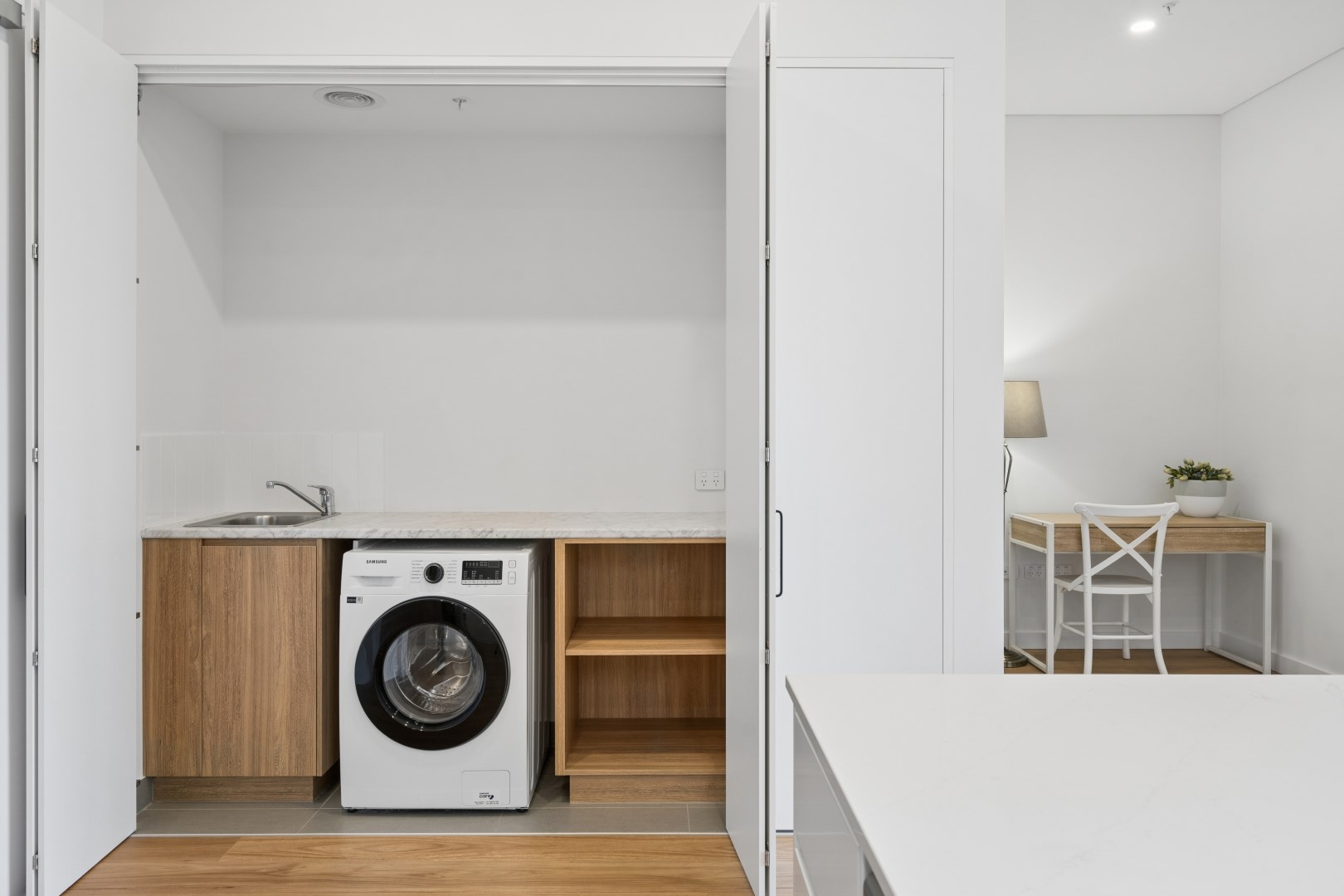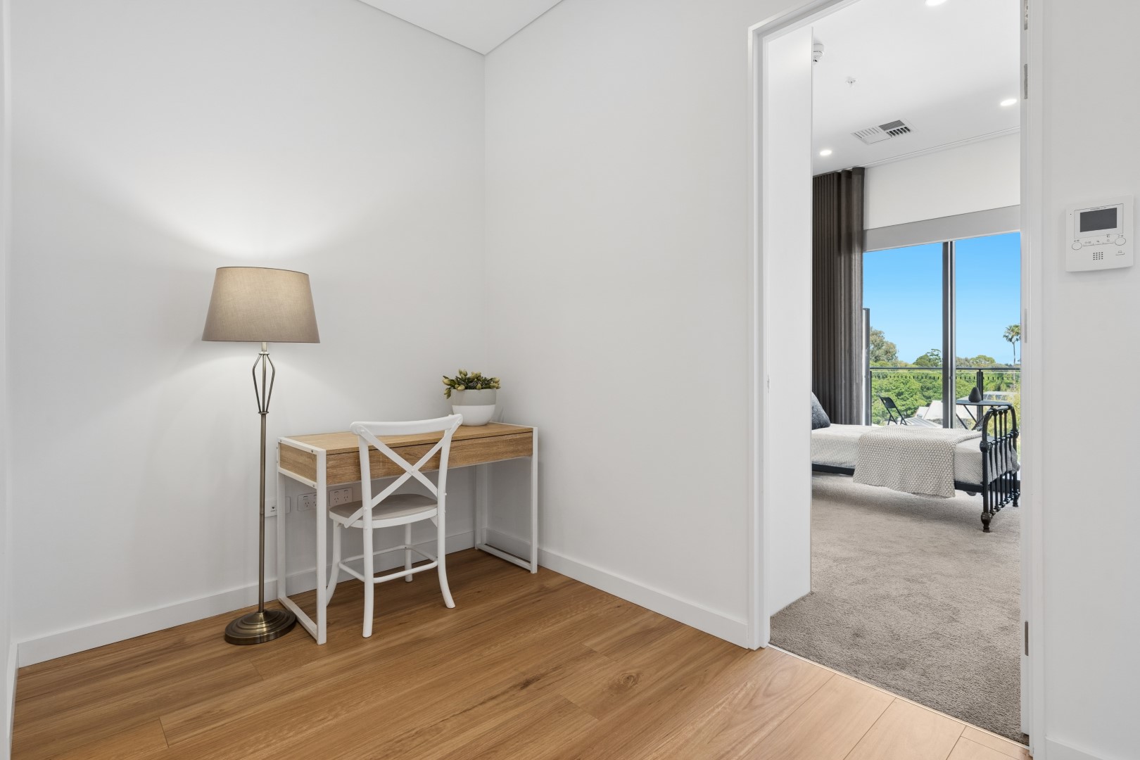 The master bedroom is thoughtfully positioned for privacy and includes a walk-in robe and a well-appointed ensuite with LED mirror vanity. The second bedroom offers built-in robe. And a dedicated study area provides flexibility for working from home or additional living space.
