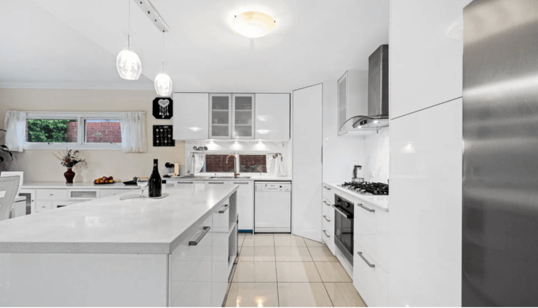 At the heart of the home is the luxuriously updated kitchen, complete with quality gas cooktop, dishwasher, and a large central island-perfect for family meals and entertaining.