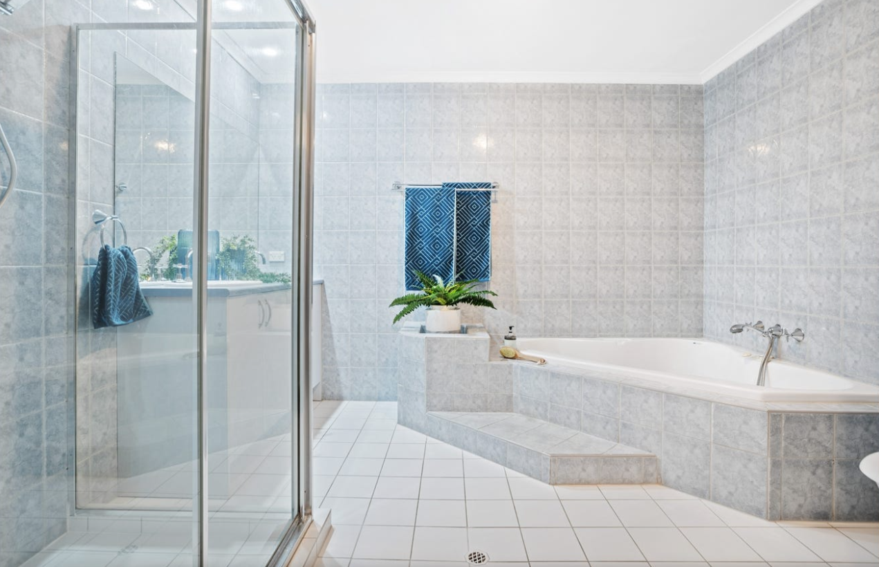 - Spacious main bathroom featuring a double vanity and large corner spa bath