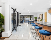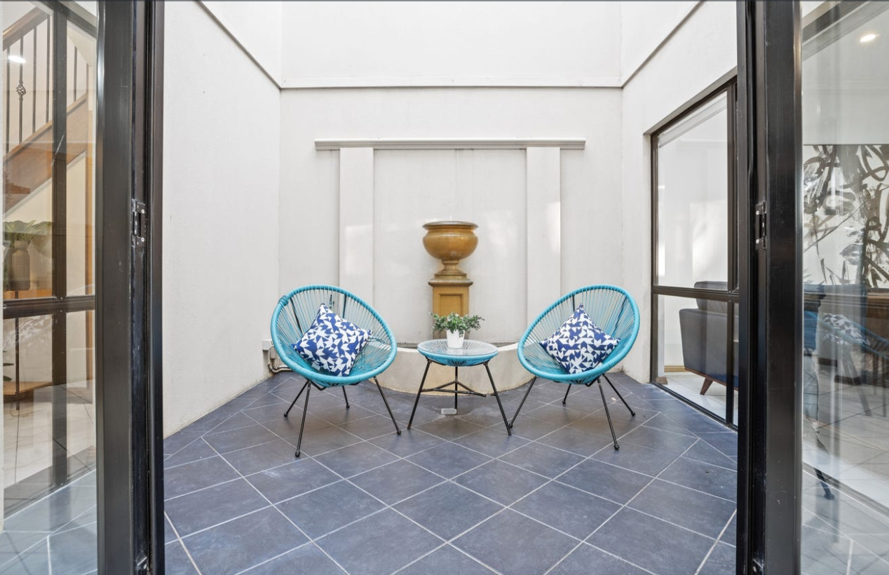 - Open-plan tiled dining area opening onto a beautiful atrium with a water feature