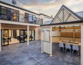 - Light-filled open-plan living area flowing past a central atrium to large glass doors, leading to an outdoor entertaining area with a covered pavilion, ceiling fan, and direct access to Josiah Mitton Reserve