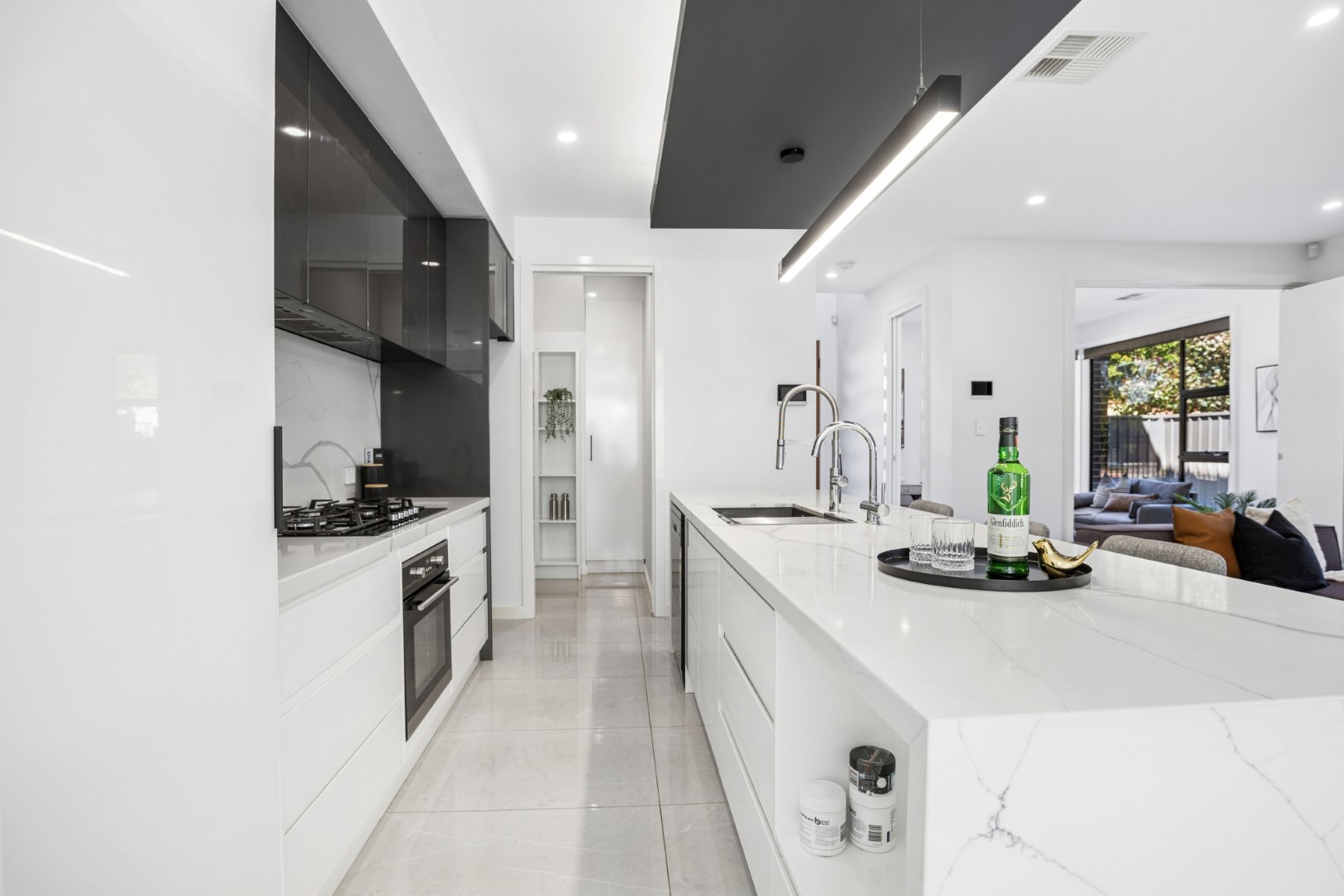 The heart of the home is the light-filled open-plan living and dining area, framed by crisp tiled floors, LED downlights and square-set ceilings. The designer kitchen features a stone waterfall island bench, stainless steel appliances, walk-in pantry and filtered water tap, seamlessly connecting to the covered alfresco entertaining area under the main roof.