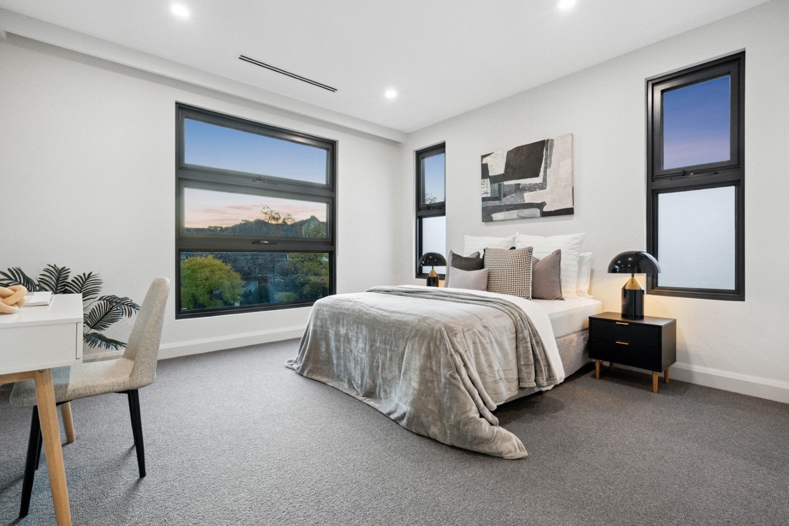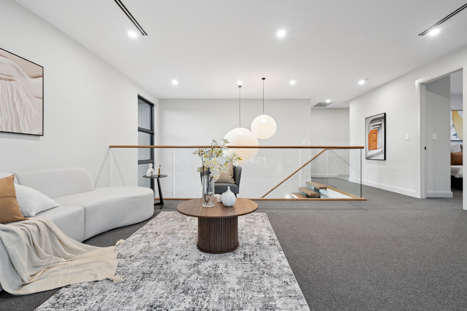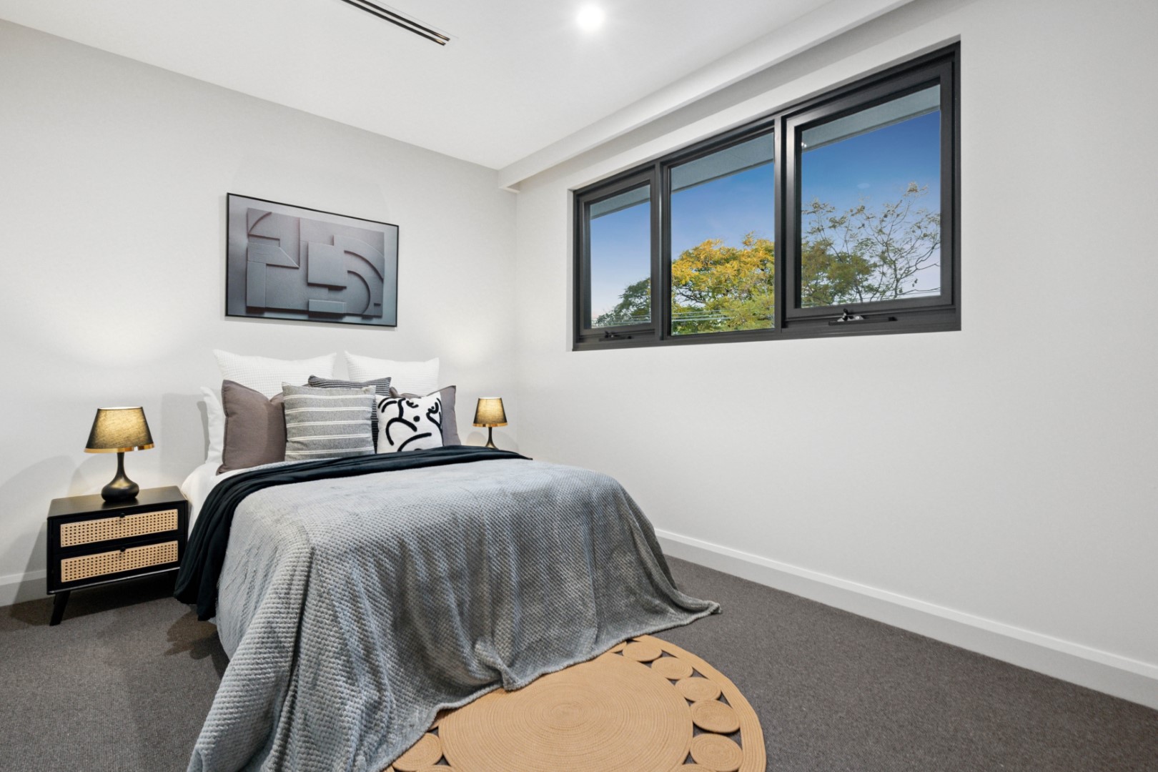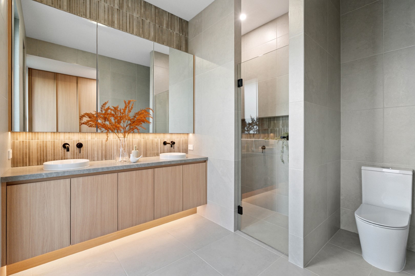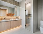 The ground floor master suite is a true sanctuary, complete with walk-in robe and a luxurious ensuite finished with Misha matt black fixtures, frameless shower and bespoke tiling. Upstairs, three generous bedrooms with pure wool carpet share a stylish retreat and central bathroom with freestanding Delara bath – a spa-like indulgence for family living.
