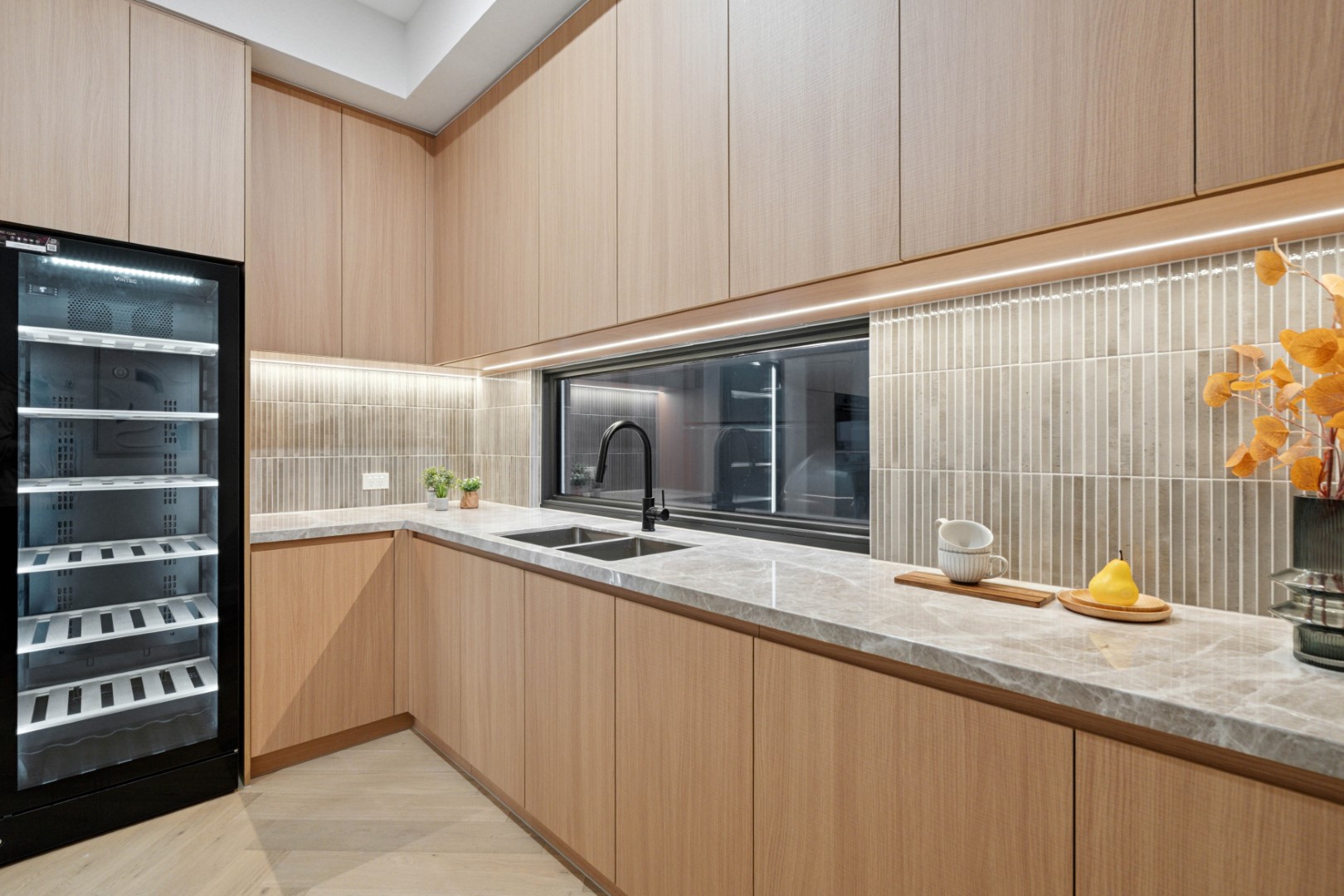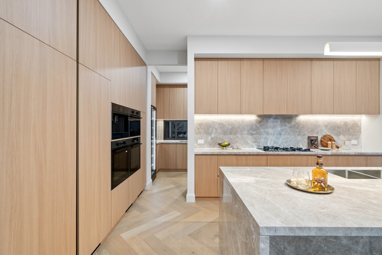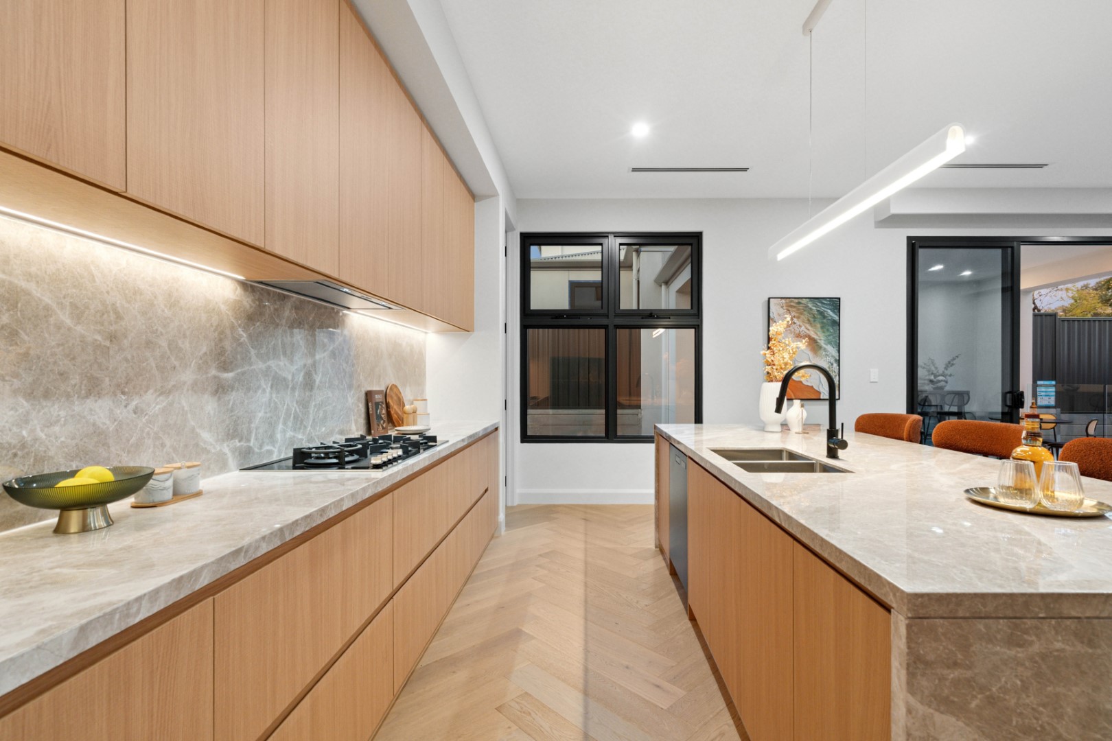 The open-plan living and dining area is anchored by a Rinnai gas fireplace and ceiling speakers, creating a warm and inviting ambience. At the heart of the home, the gourmet kitchen features natural stone benchtops, premium Asko appliances including a 900mm gas cooktop and steam oven, and an integrated Miele refrigerator/freezer. A butler’s pantry with additional cooking facilities, wine storage and a Vintec wine cabinet elevates the entertainer’s lifestyle.