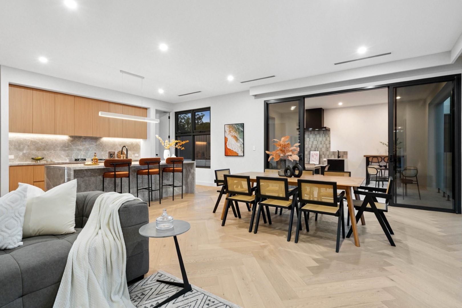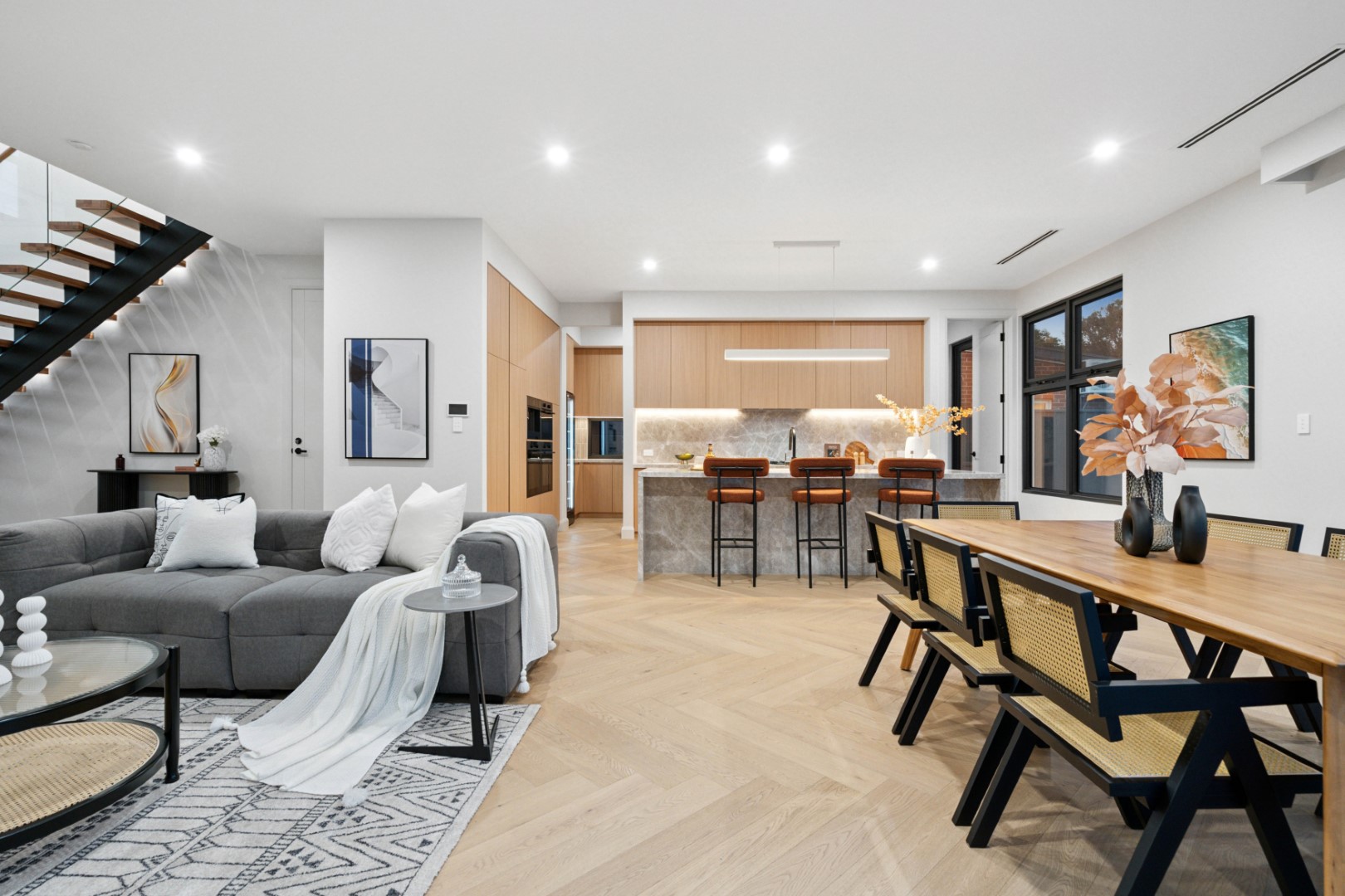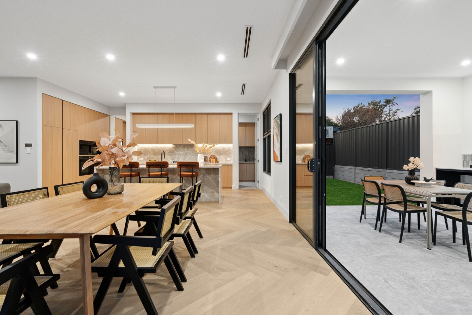 Offering 4 bedrooms, 3 bathrooms and a double garage, the home is perfectly tailored for families or those seeking a spacious retreat. Soaring 3.0m ceilings on the ground floor, engineered herringbone timber flooring and double-glazed windows set a tone of refinement throughout.