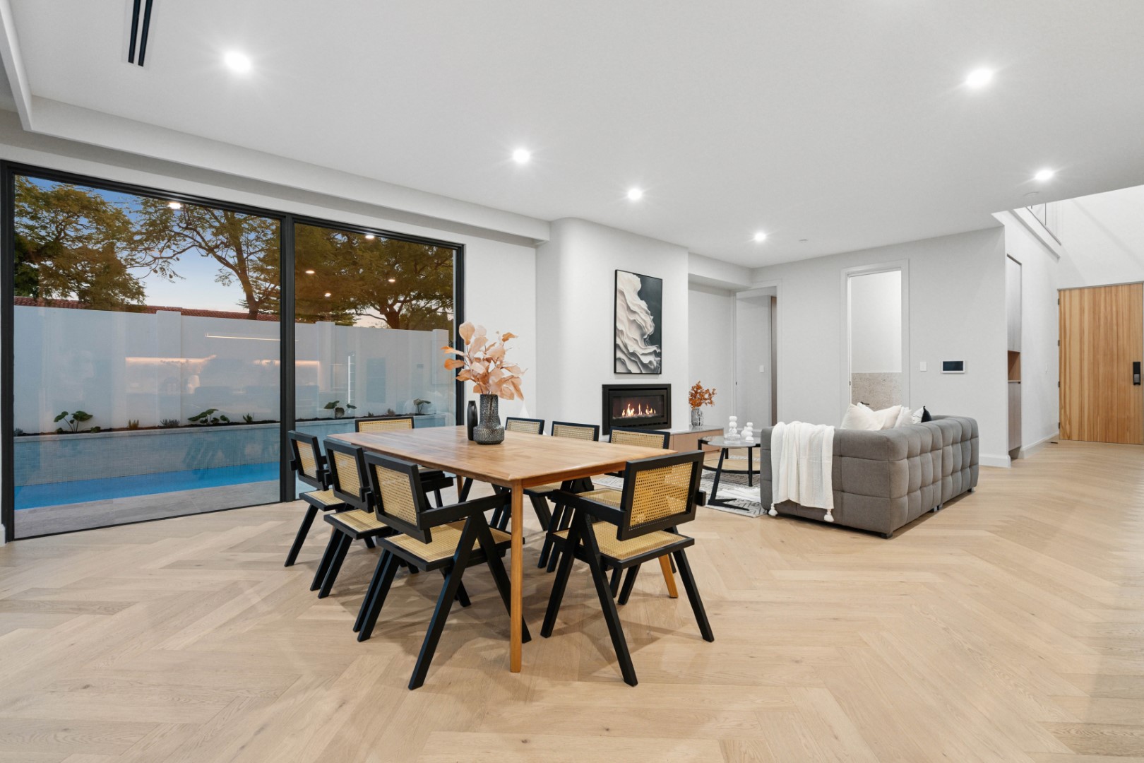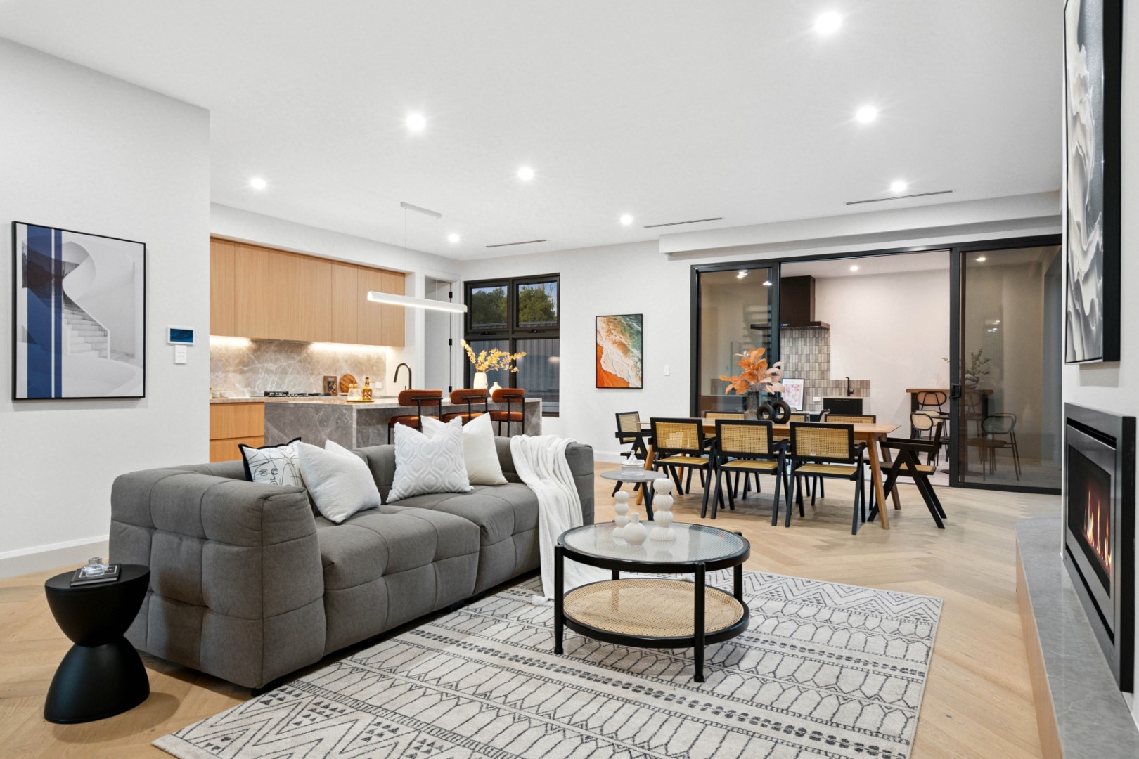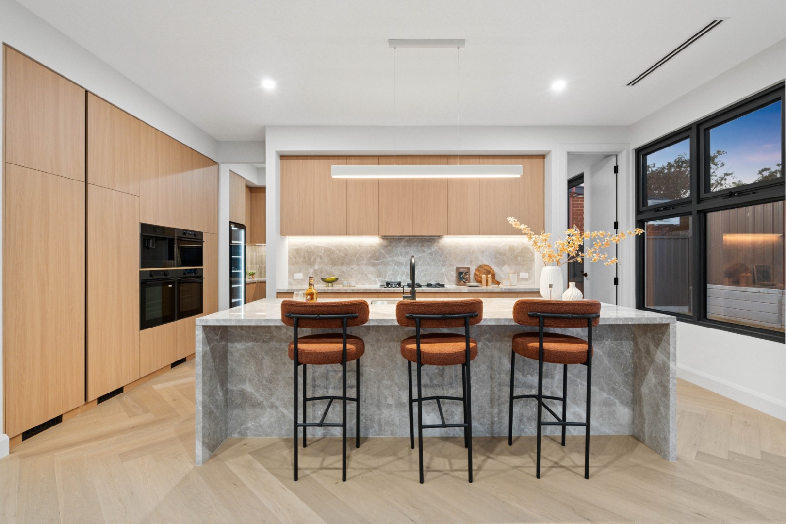 Offering 4 bedrooms, 3 bathrooms and a double garage, the home is perfectly tailored for families or those seeking a spacious retreat. Soaring 3.0m ceilings on the ground floor, engineered herringbone timber flooring and double-glazed windows set a tone of refinement throughout.