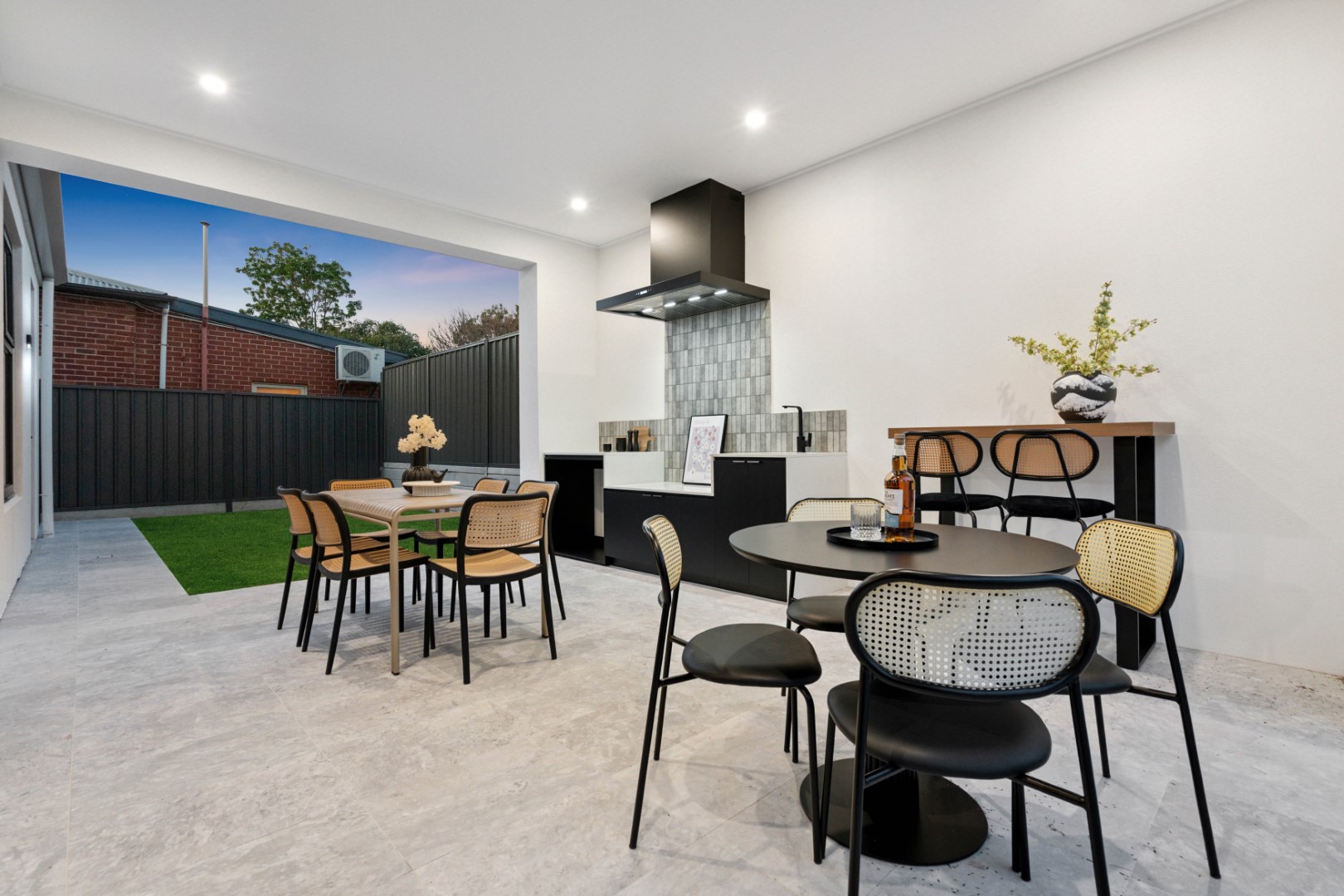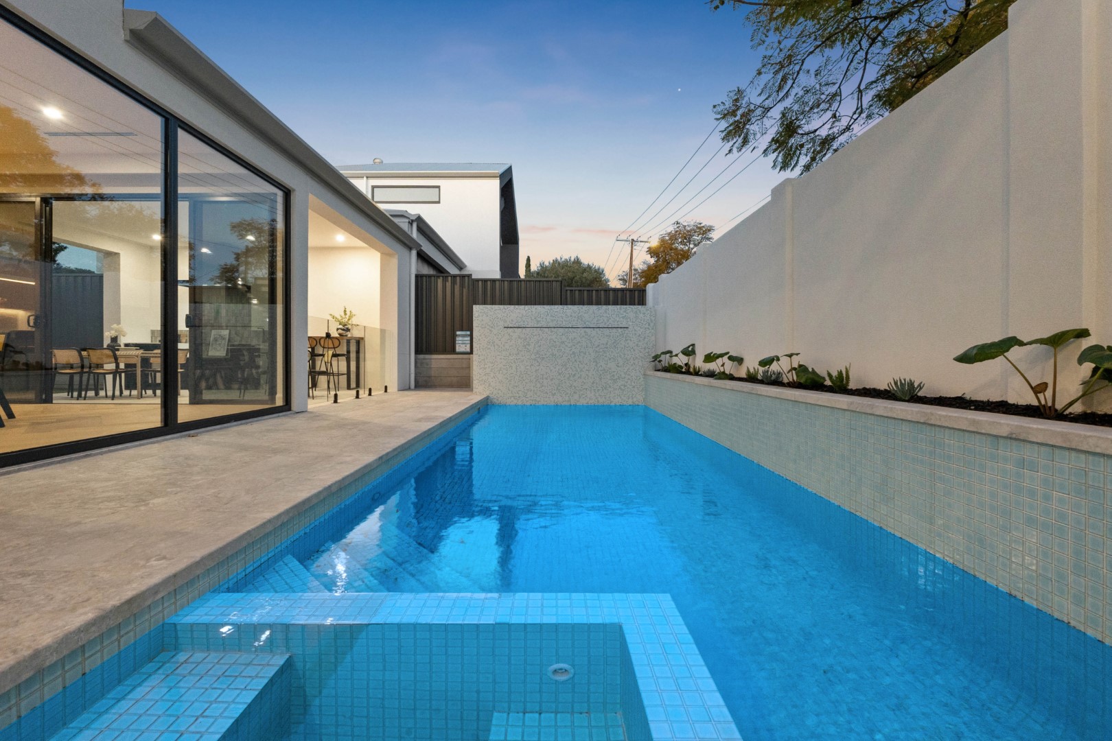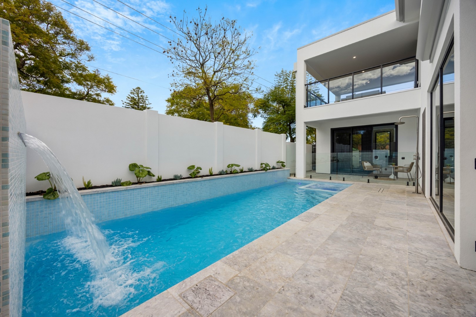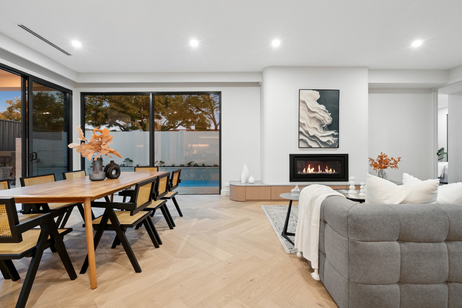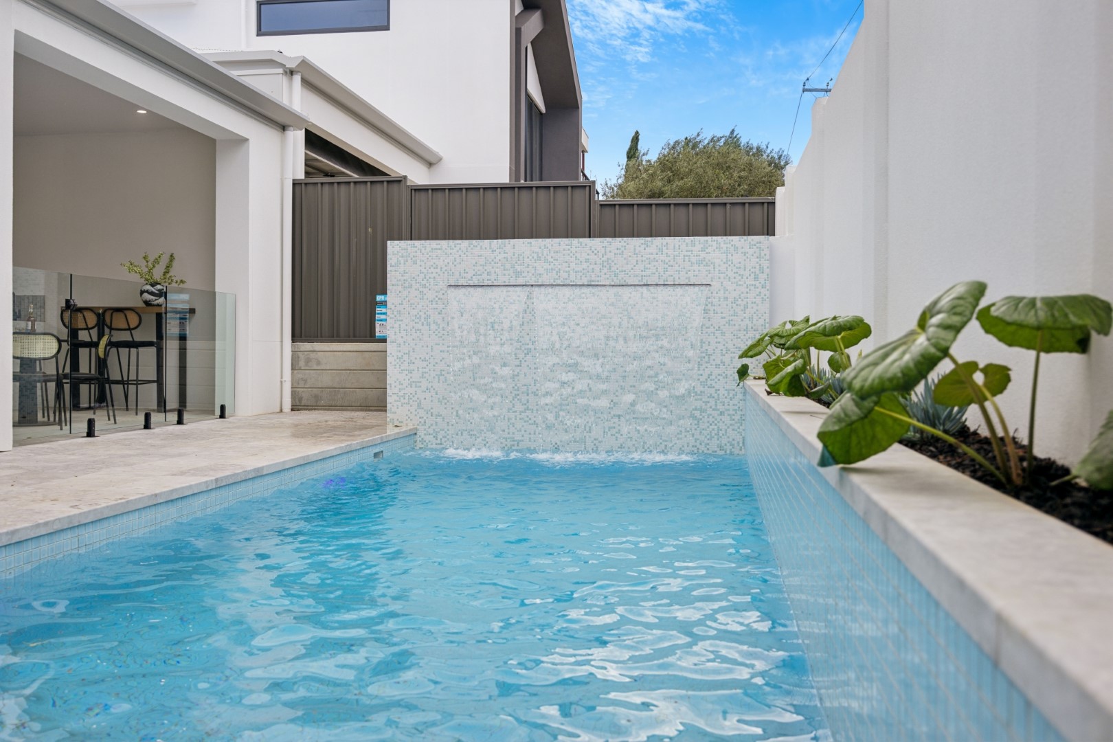 Seamlessly flowing from the living area, the alfresco space is designed for year-round enjoyment. Featuring a Euro outdoor kitchen with BBQ, canopy rangehood and beverage centre, it overlooks the landscaped garden, sparkling pool and spa with LED lighting and frameless glass fencing – the perfect backdrop for entertaining.