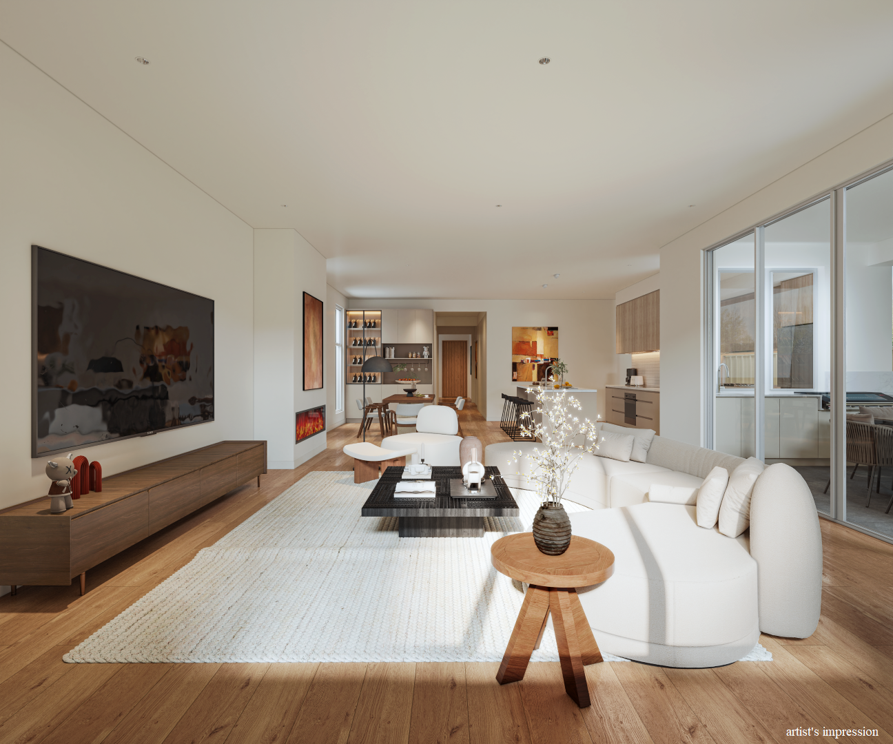 - Expansive open-plan living and dining area with feature fireplace