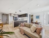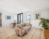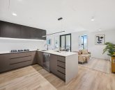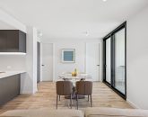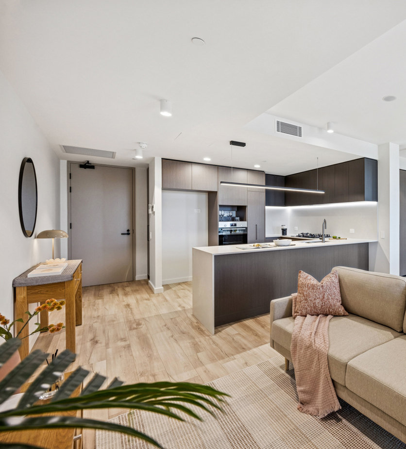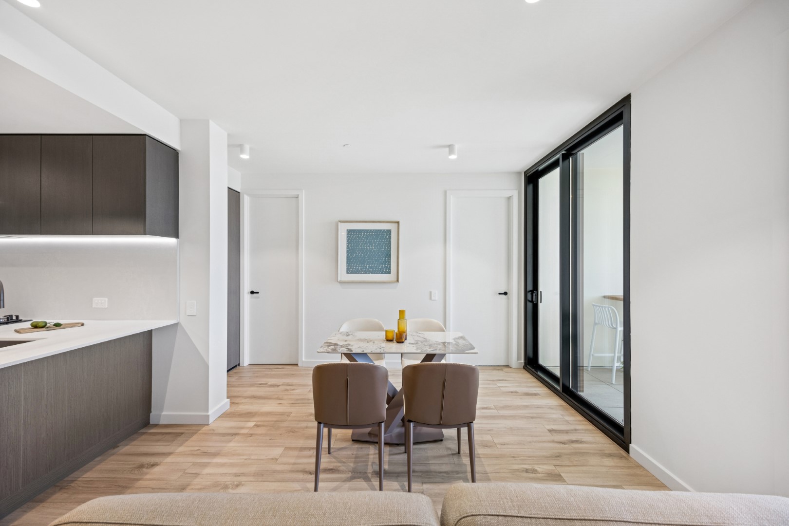 The thoughtfully designed layout provides exceptional functionality. The open-plan kitchen, dining, and living area flows seamlessly to a private balcony, creating a light-filled space ideal for relaxing or entertaining. Both bedrooms are well separated for privacy, with the master suite featuring an elegant ensuite and walk-in robe. Premium finishes, timber-look flooring, and full-height double glazed glass, windows enhance the sense of modern sophistication throughout.