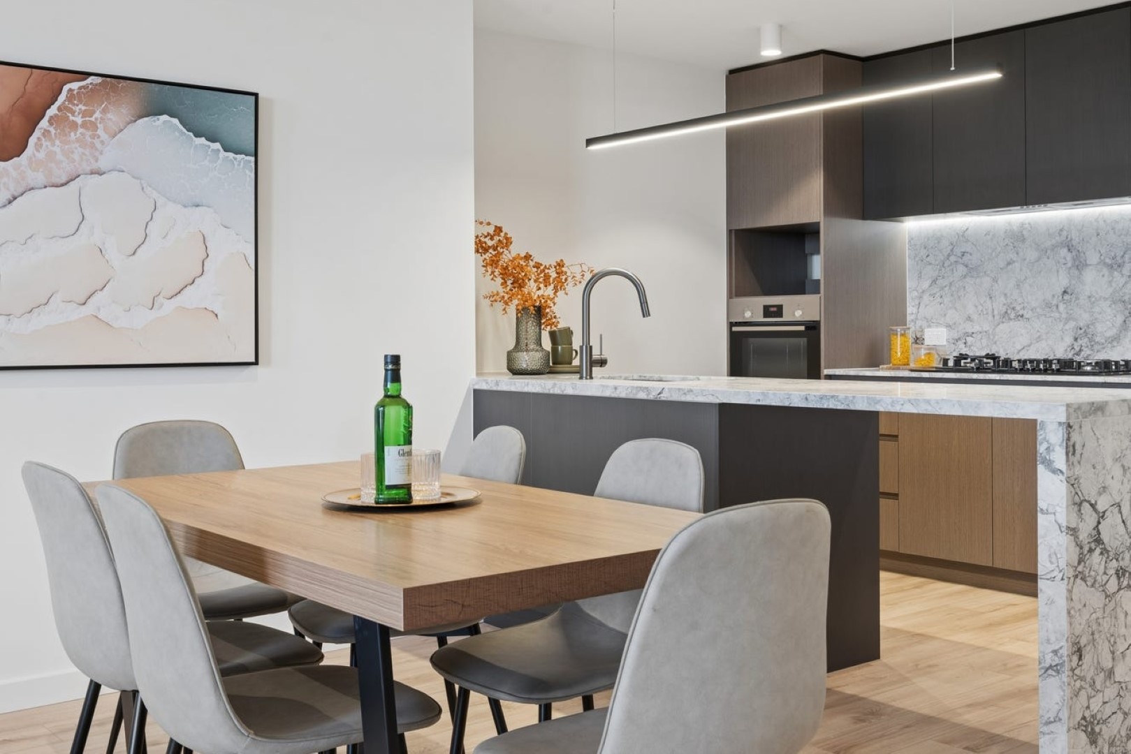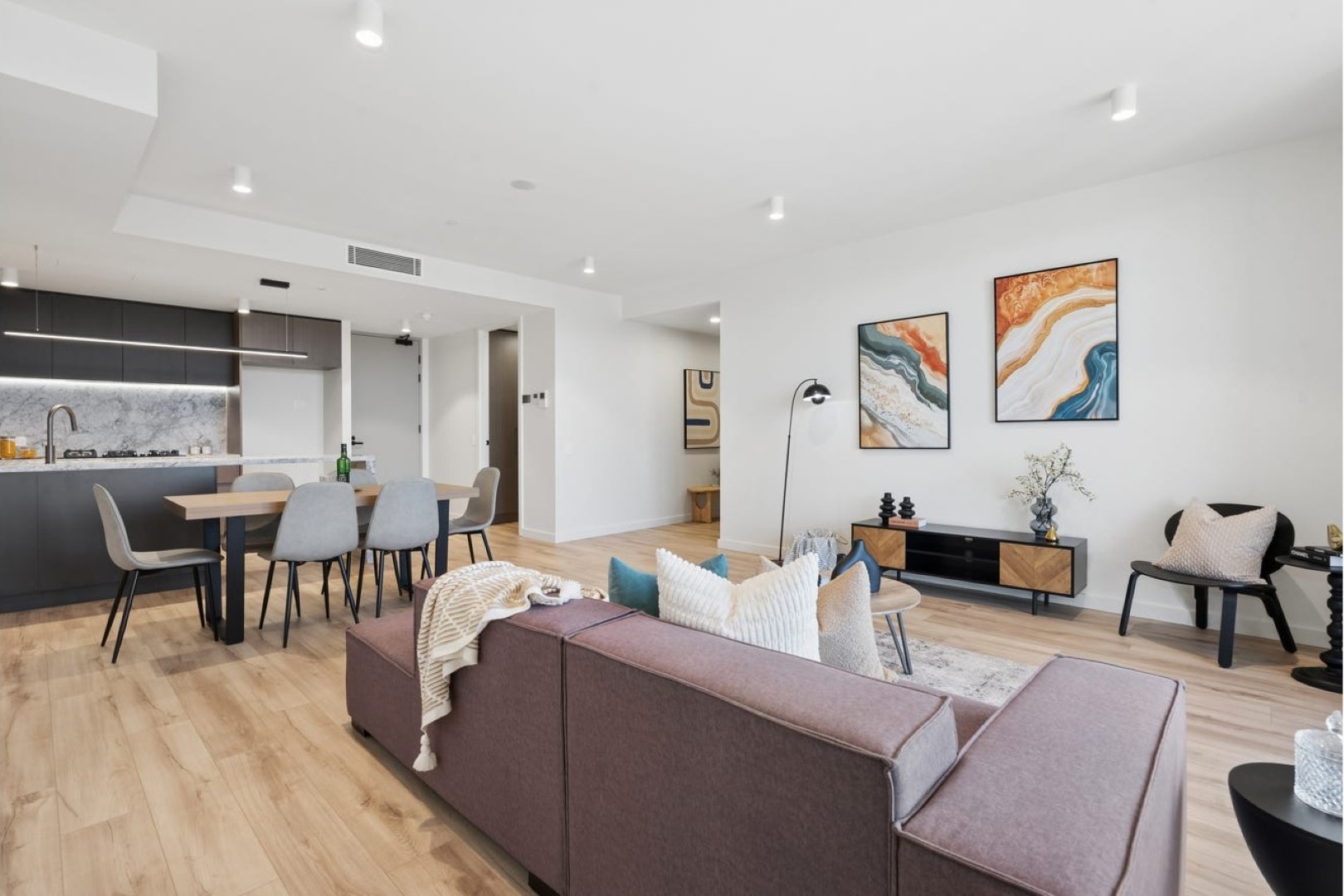 From the moment you enter, the apartment reveals a sophisticated open-plan layout where the living and dining spaces flow effortlessly together, creating a warm yet elegant atmosphere ideal for both everyday living and entertaining. Floor-to-ceiling glazing welcomes natural light throughout the home while seamlessly connecting the interior space to the oversized balcony, providing the perfect setting for relaxing evenings or hosting guests.