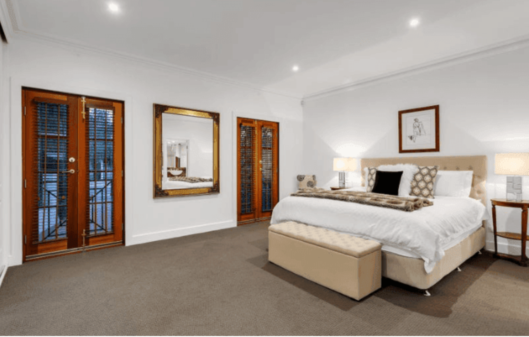The spacious master bedroom features a well-appointed ensuite and wooden French doors opening onto twin Juliette balconies.